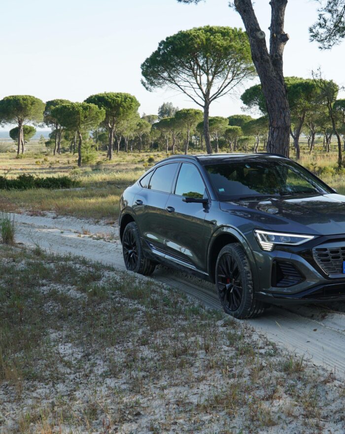 Reposant sur la plateforme MEB du groupe Volkswagen, le Q4 Sportback e‑tron affiche un style moderne et athlétique. Sa chute de toit, ses jantes jusqu’à 21 pouces et sa teinte Bleu Navarre lui donnent une allure statutaire. Vu de profil ou de trois‑quarts arrière, il révèle toute sa personnalité, entre élégance et efficacité aérodynamique.
